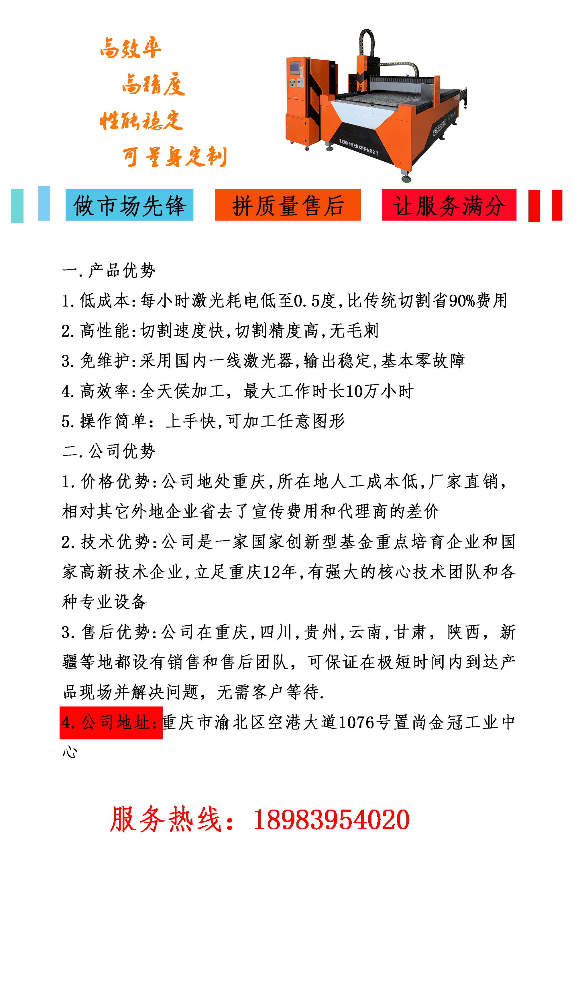 重慶依斯普激光技術股份有限公司 是一家科技型高新技術企業,公司位于重慶市渝北區空港大道1076號置尚金冠工業中心,占地面積約五千平方米,吸收了國外的先進的技術,專業研發、制造和銷售各類激光控制技術應用類產品。公司被評為創新基金重點培育企業,專精特新企業,通過了ISO9001質量管理體系認證,產品多次獲得重慶市高新技術產品證書及實用新型專利證書等。 依斯普激光的主導產品為激光切割機系列、激光焊接機系列,激光打標機及氣動打標機系列等,廣泛應用在